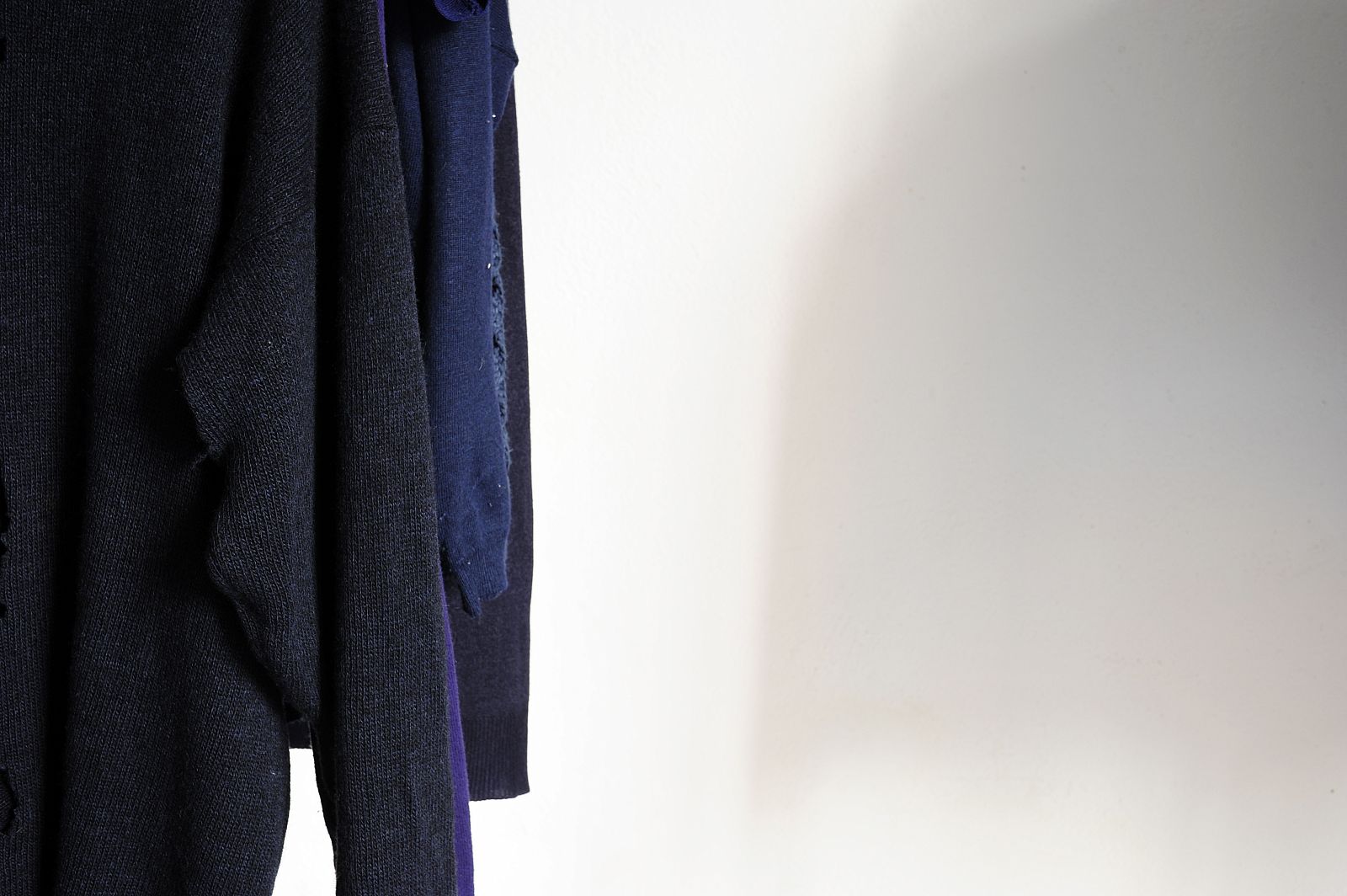Through an ensemble of pre-owned sweaters and hand-sewn pieces, Fabienne Audéoud interprets and modulates the textile meaning of navy blue, as it appears in ready-to-wear, like a symptom or a slip of the tongue, rising from the monarchic and military unconscious. Inherited from a royal emblem, derived from a pigment historically tied to the slave trade, and later absorbed into republican ideology, navy blue stains our social landscape. While ‘to pull over’ orders one to step aside, Audéoud’s pullovers imagine glitches in the disciplined grammar of the uniform, turning their very irregularities into ornament and excess.